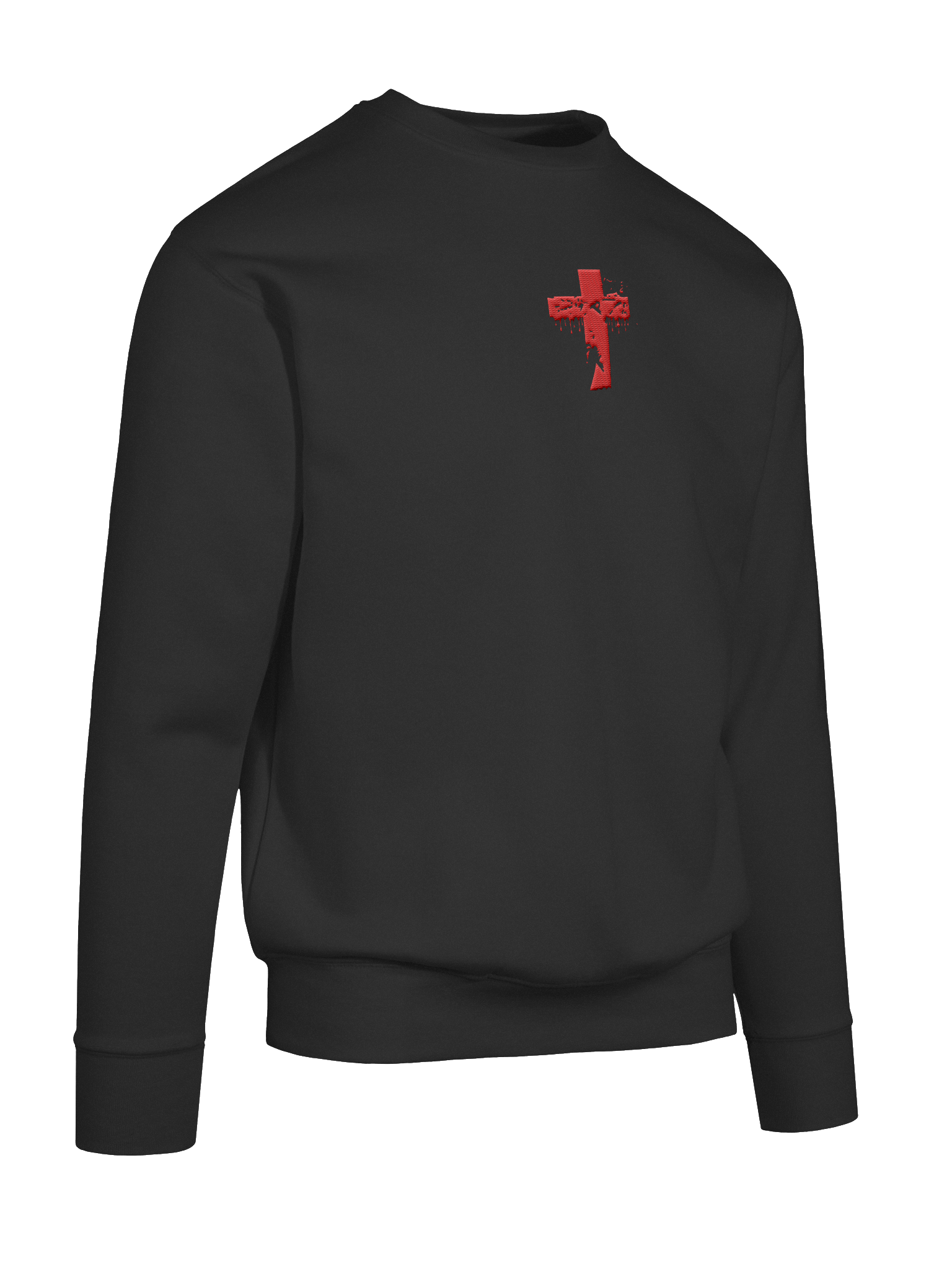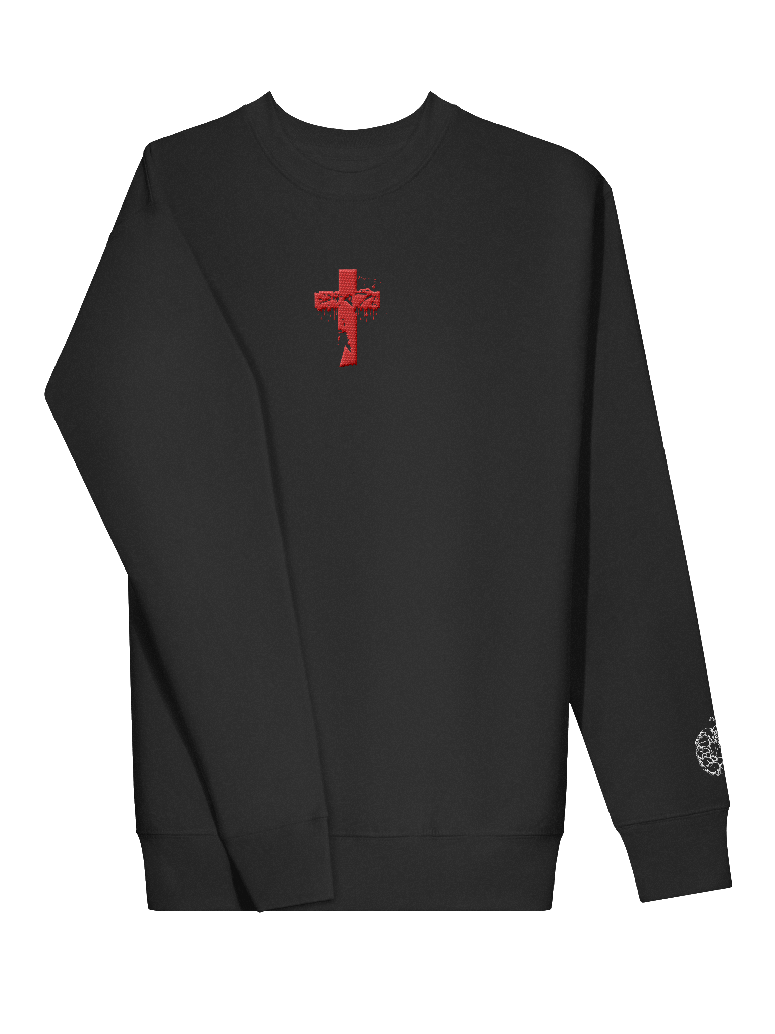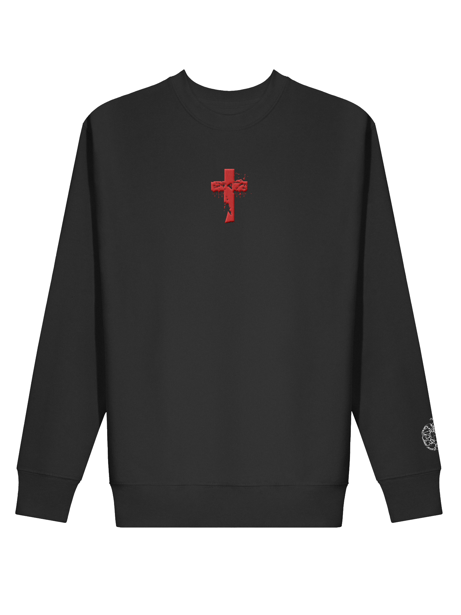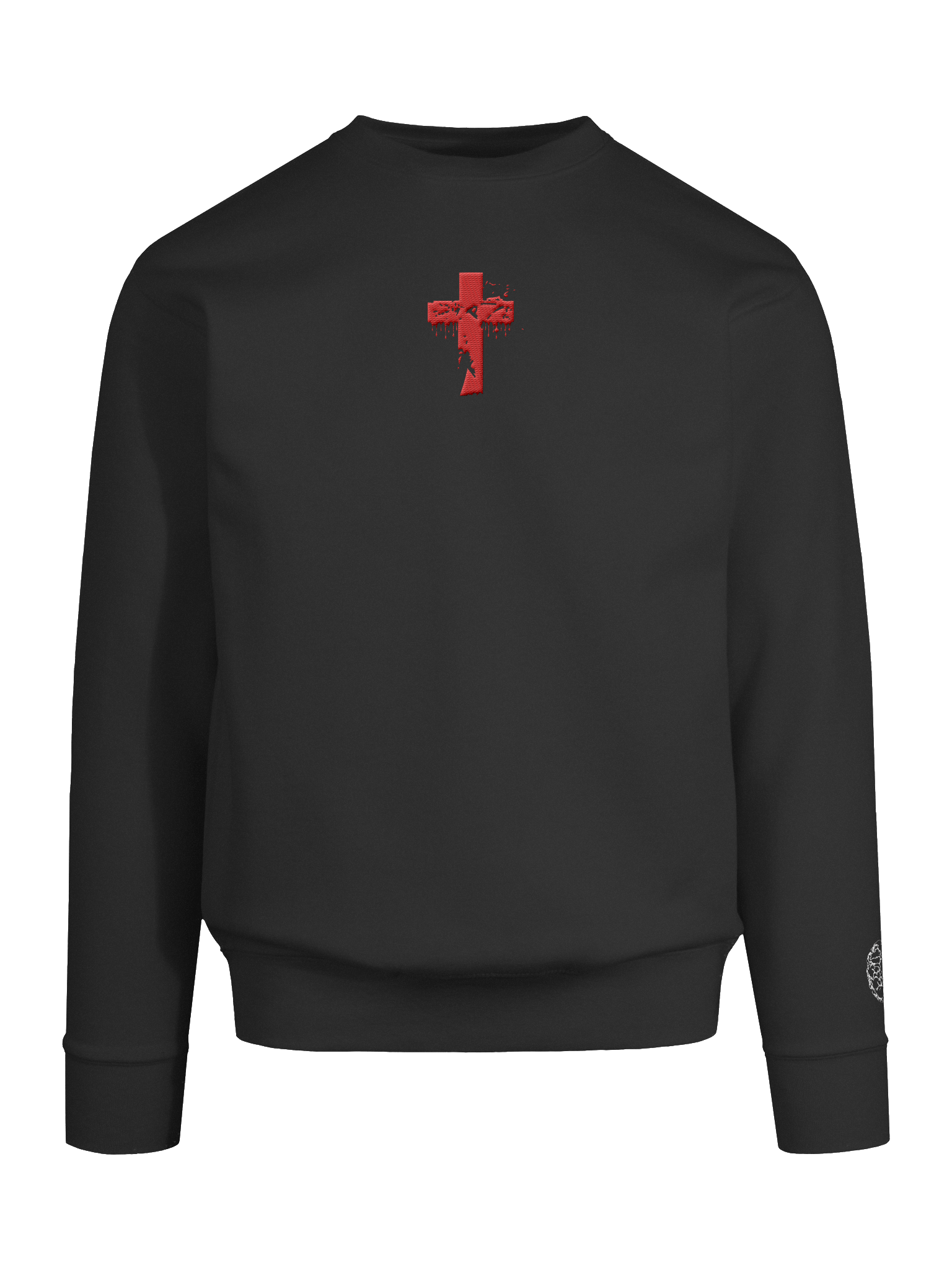 This premium victory cross embroidered sweatshirt features a striking red cross design centered on the chest, crafted from eco-friendly materials. The minimalist aesthetic showcases clean lines with a subtle logo detail on the sleeve. Available in multiple colorways including this classic black version, this sweatshirt combines spiritual symbolism with contemporary streetwear style. The relaxed fit and quality construction make it perfect for both casual wear and making a meaningful statement.