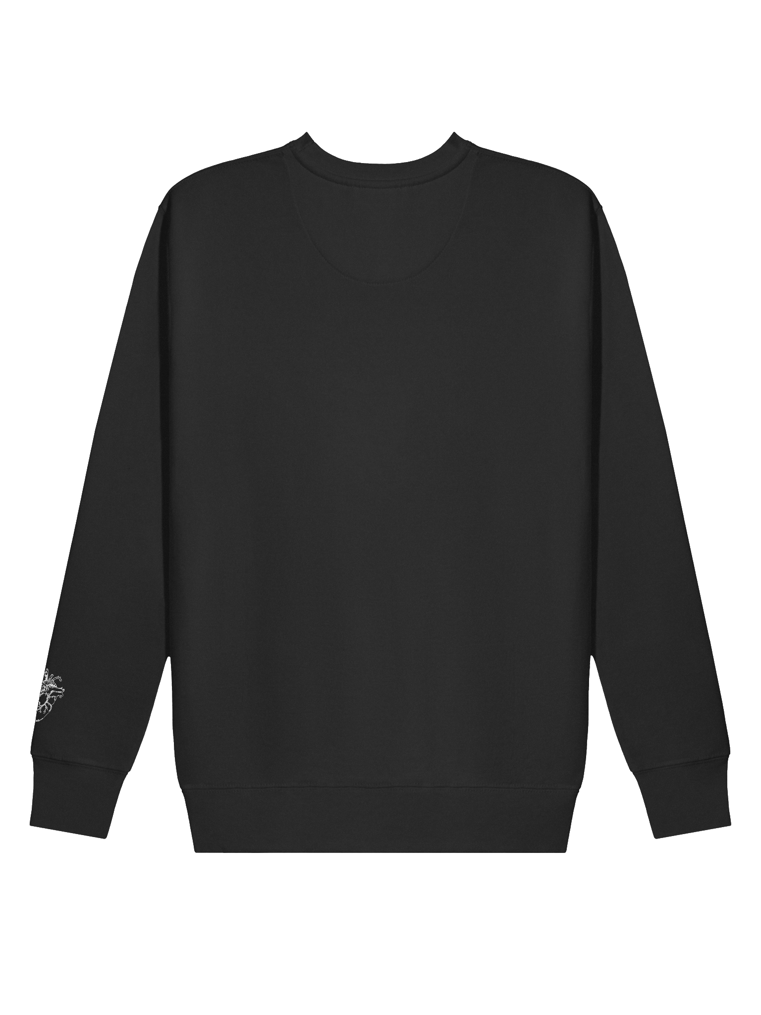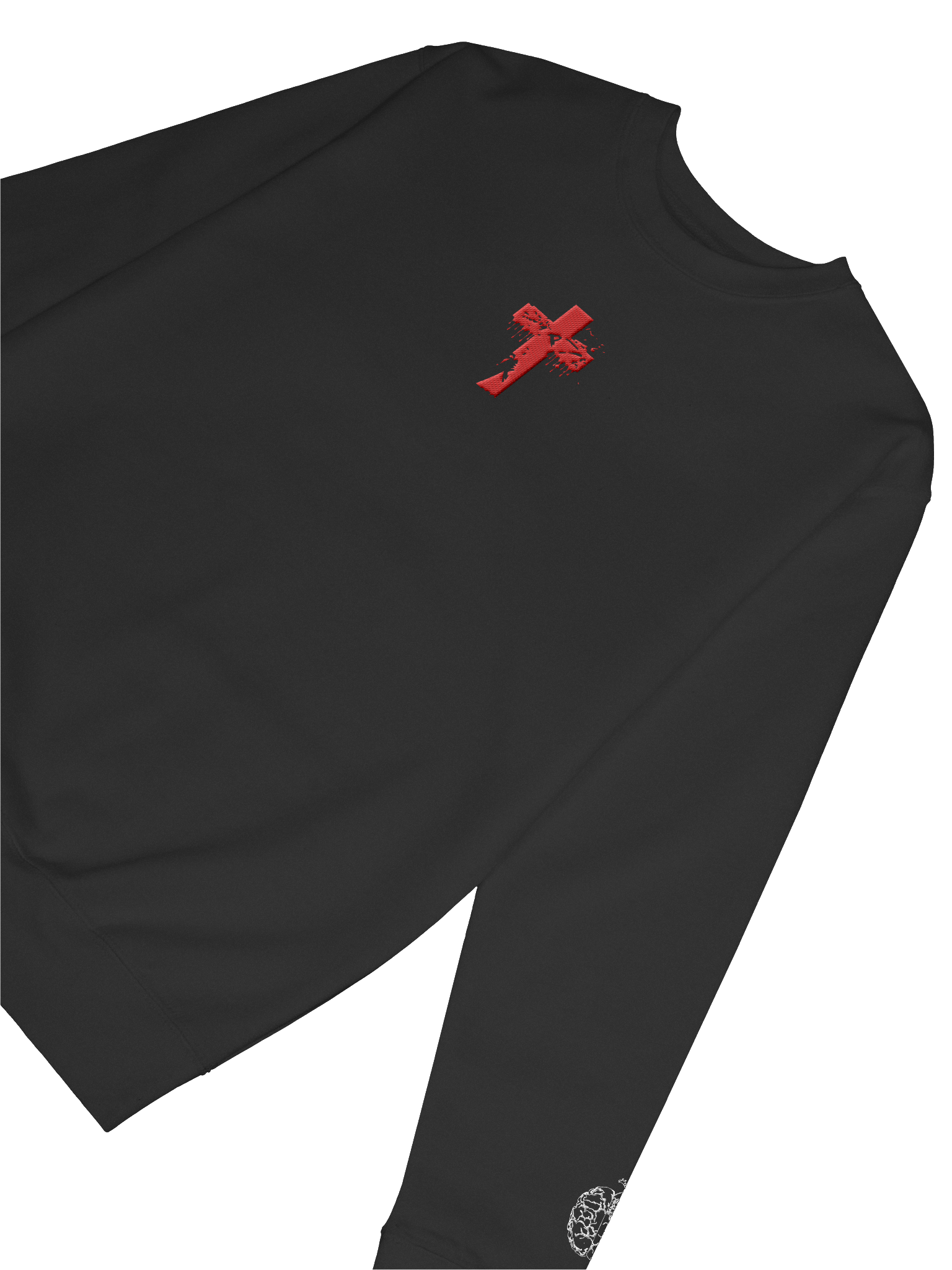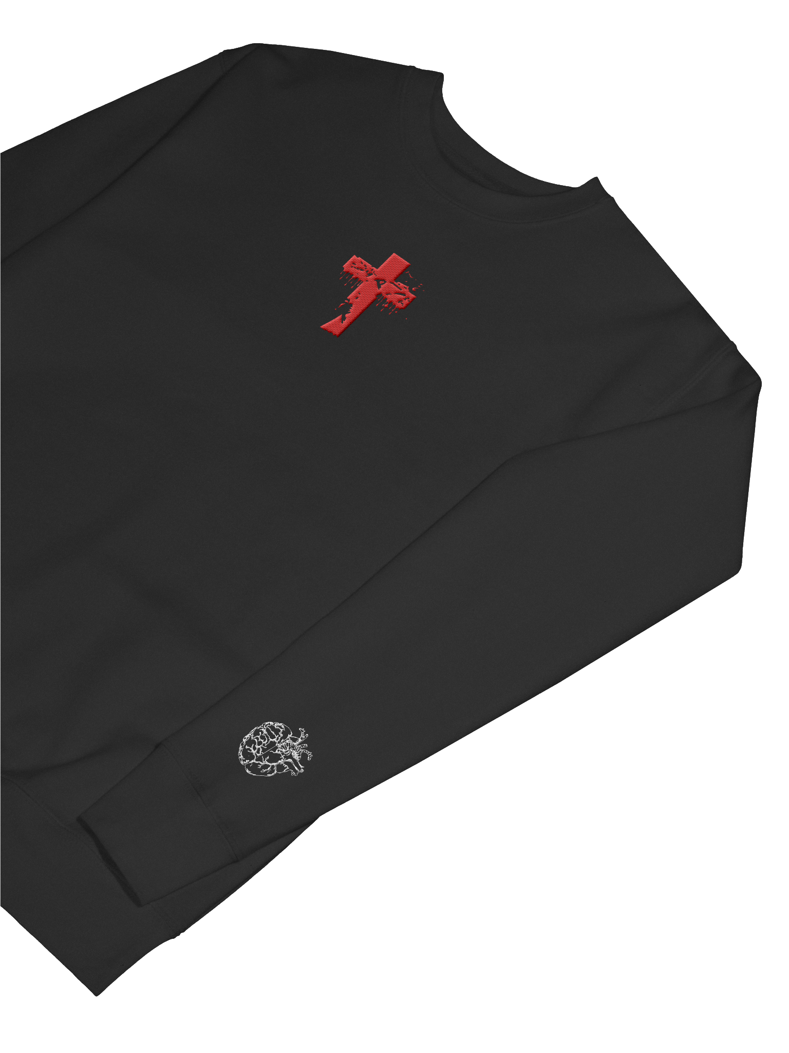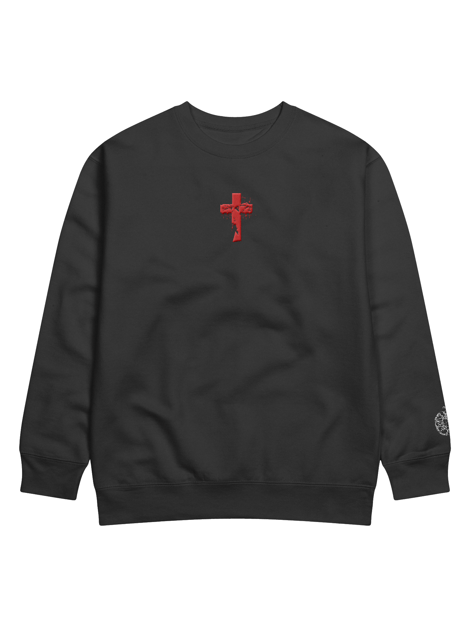 This premium victory cross embroidered sweatshirt features a striking red cross design centered on the chest, crafted from eco-friendly materials. The minimalist aesthetic showcases clean lines with a subtle logo detail on the sleeve. Available in multiple colorways including this classic black version, this sweatshirt combines spiritual symbolism with contemporary streetwear style. The relaxed fit and quality construction make it perfect for both casual wear and making a meaningful statement.